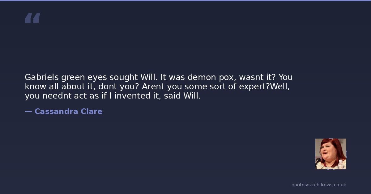 Gabriels green eyes sought Will. It was demon pox, wasnt it? You know all about it, dont you? Arent you some sort of expert?Well, you neednt act as if I invented it, said Will.