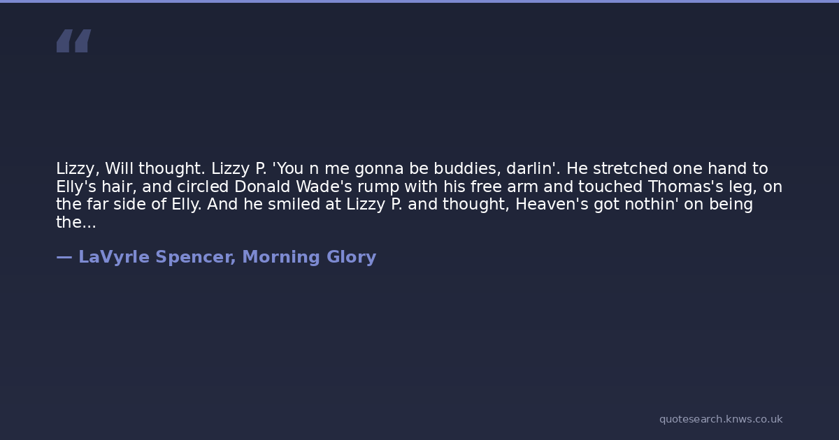 Lizzy, Will thought. Lizzy P. 'You n me gonna be buddies, darlin'. He stretched one hand to Elly's hair, and circled Donald Wade's rump with his free arm and touched Thomas's leg, on the far side of Elly. And he smiled at Lizzy P. and thought, Heaven's got nothin' on being the husband of Eleanor Dinsmore.