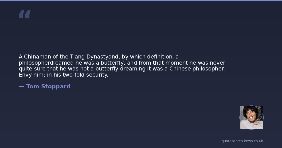 A Chinaman of the T'ang Dynastyand, by which definition, a philosopherdreamed he was a butterfly, and from that moment he was never quite sure that he was not a butterfly dreaming it was a Chinese philosopher. Envy him; in his two-fold security.
