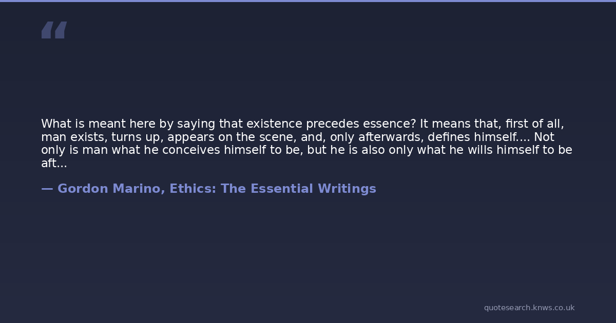 What is meant here by saying that existence precedes essence? It means that, first of all, man exists, turns up, appears on the scene, and, only afterwards, defines himself.... Not only is man what he conceives himself to be, but he is also only what he wills himself to be after this thrust toward existence. Whereas a table is a table is a table, humans have no preexisting essence and so define themselves,