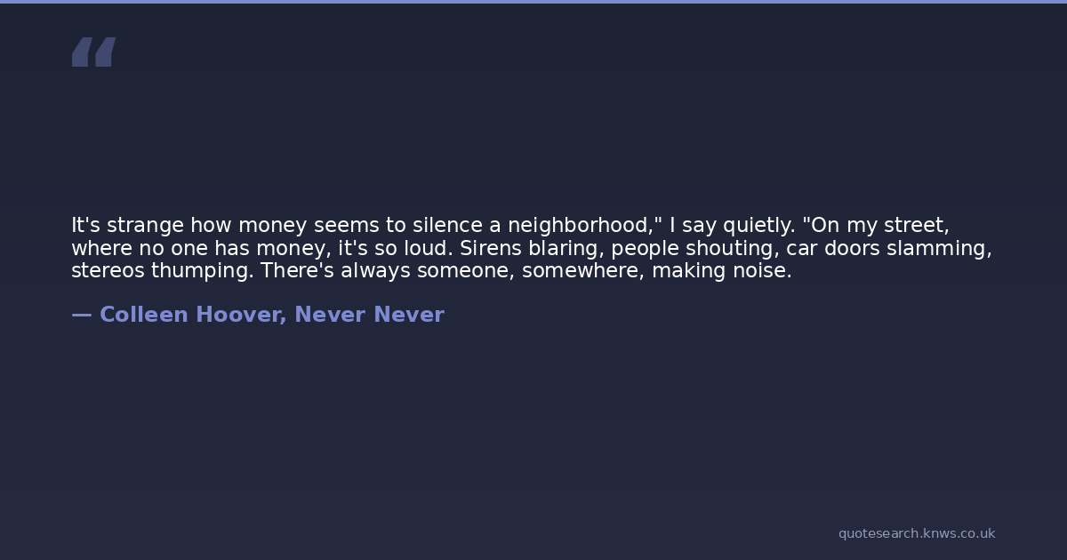 It's strange how money seems to silence a neighborhood," I say quietly. "On my street, where no one has money, it's so loud. Sirens blaring, people shouting, car doors slamming, stereos thumping. There's always someone, somewhere, making noise.