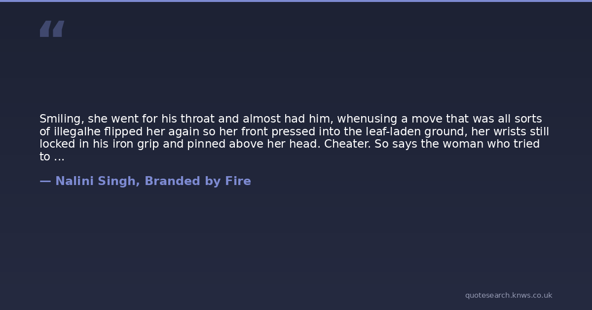 Smiling, she went for his throat and almost had him, whenusing a move that was all sorts of illegalhe flipped her again so her front pressed into the leaf-laden ground, her wrists still locked in his iron grip and pinned above her head. Cheater. So says the woman who tried to kick my balls into my throat, he pointed out, even as he licked the salt off the skin of her neck in a lazy and highly provocative move.