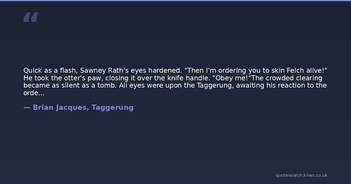 Quick as a flash, Sawney Rath's eyes hardened. "Then I'm ordering you to skin Felch alive!" He took the otter's paw, closing it over the knife handle. "Obey me!"The crowded clearing became as silent as a tomb. All eyes were upon the Taggerung, awaiting his reaction to the order.Tagg turned his back on Sawney and strode to the side of the fox strung up to the beech bough. He raised the blade. Felch shut his eyes tight, his head shaking back and forth as his nerves quivered uncontrollably. With a sudden slash Tagg severed the thongs that bound him. Felch slumped to the ground in a shaking heap. Tagg's voice was flat and hard as he turned to face Sawney."I'm sorry to disobey your order. The fox is a sorry thief, but I will not take the life of a helpless beast.