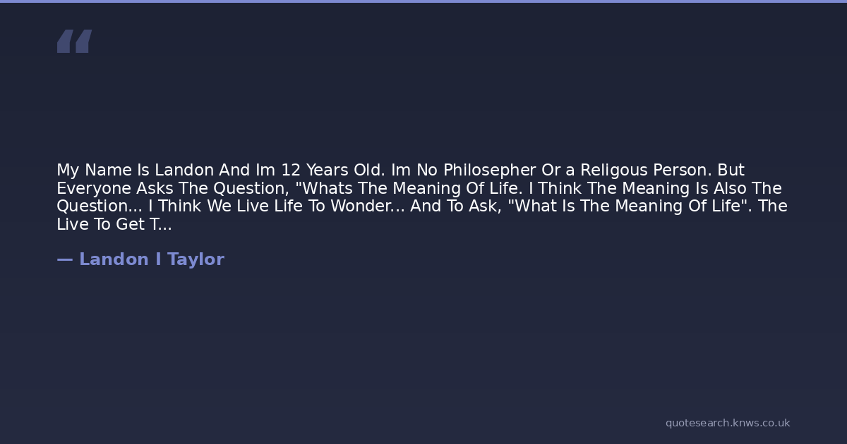 My Name Is Landon And Im 12 Years Old. Im No Philosepher Or a Religous Person. But Everyone Asks The Question, "Whats The Meaning Of Life. I Think The Meaning Is Also The Question... I Think We Live Life To Wonder... And To Ask, "What Is The Meaning Of Life". The Live To Get To The End And Find Out Why They Lived And What Was Their Purpose...