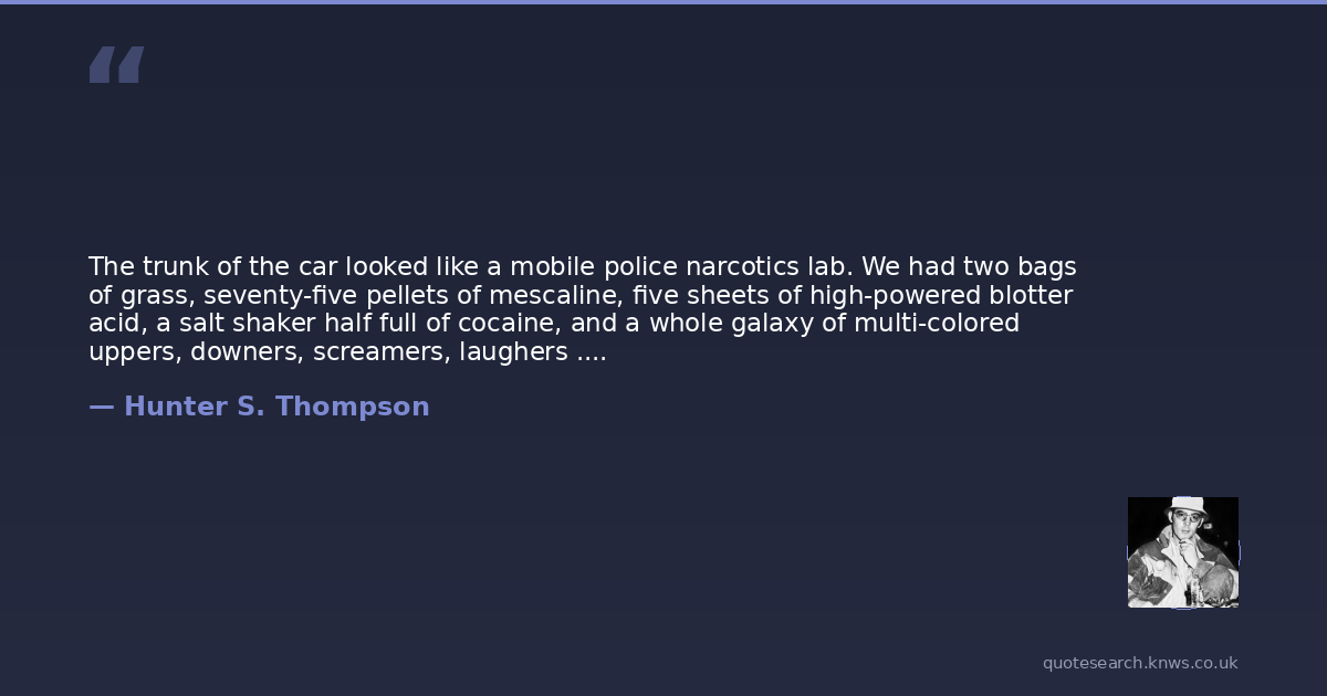 The trunk of the car looked like a mobile police narcotics lab. We had two bags of grass, seventy-five pellets of mescaline, five sheets of high-powered blotter acid, a salt shaker half full of cocaine, and a whole galaxy of multi-colored uppers, downers, screamers, laughers . . . and also a quart of tequila, a quart of rum, a case of Budweiser, a pint of raw ether and two dozen amyls . . . Not that we needed all that for the trip, but once you get locked into a serious drug collection, the tendency is to push it as far as you can. The only thing that really worried me was the ether. There is nothing in the world more helpless and irresponsible and depraved than a man in the depths of an ether binge. And I knew we'd get into that rotten stuff pretty soon.