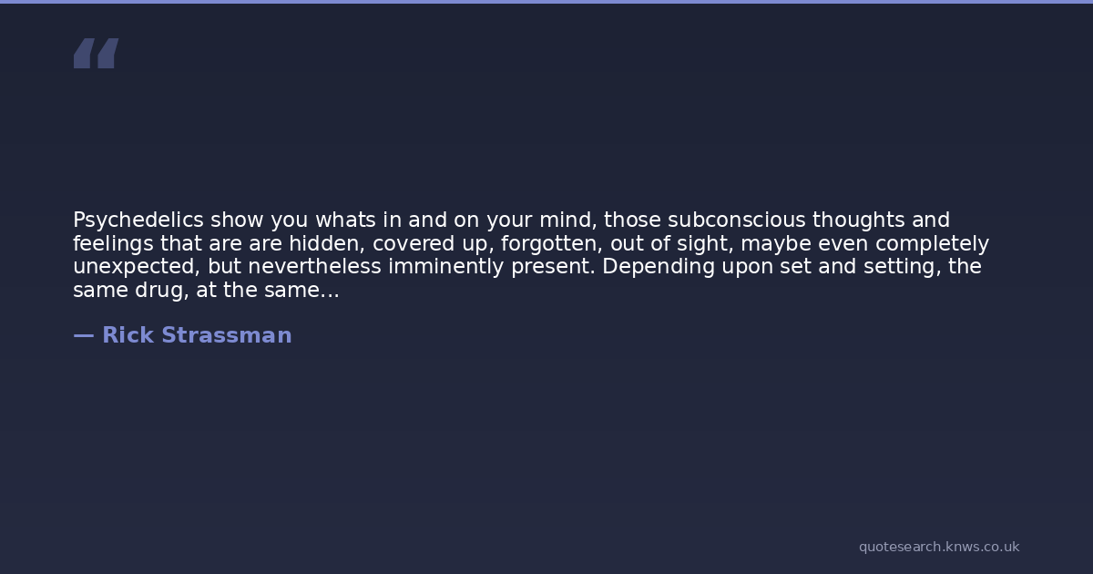 Psychedelics show you whats in and on your mind, those subconscious thoughts and feelings that are are hidden, covered up, forgotten, out of sight, maybe even completely unexpected, but nevertheless imminently present. Depending upon set and setting, the same drug, at the same dose, can cause vastly different responses in the same person. One day, very little happens; another day, you soar, full of ecstatic and insightful discoveries; the next, you struggle through a terrifying nightmare. The generic nature of psychedelic, a term wide open to interpretation, suits these effects.