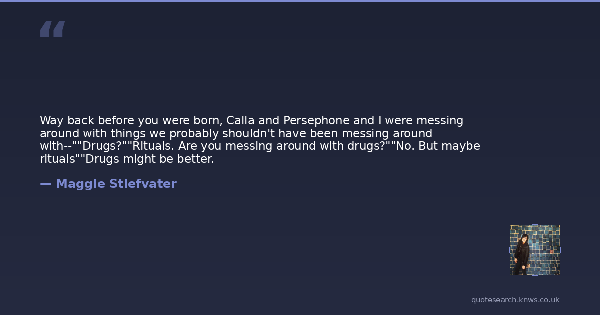 Way back before you were born, Calla and Persephone and I were messing around with things we probably shouldn't have been messing around with--""Drugs?""Rituals. Are you messing around with drugs?""No. But maybe rituals""Drugs might be better.