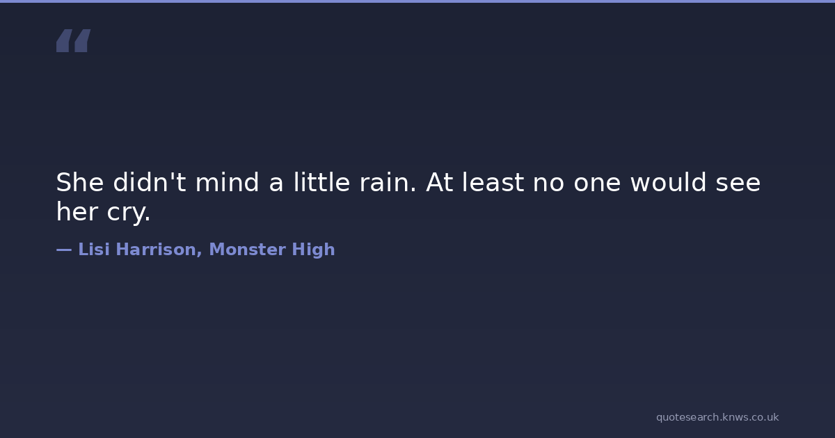 She didn't mind a little rain. At least no one would see her cry. concealing cry disgusing tears Download Image Share on X Share on Facebook Copy Link