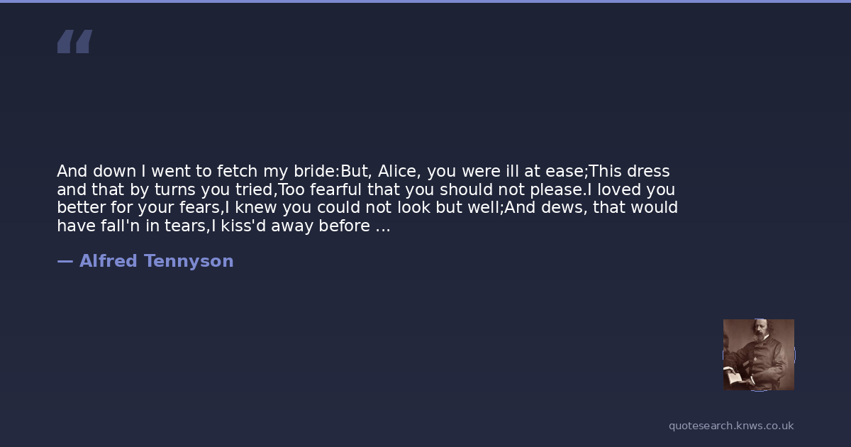 And down I went to fetch my bride:But, Alice, you were ill at ease;This dress and that by turns you tried,Too fearful that you should not please.I loved you better for your fears,I knew you could not look but well;And dews, that would have fall'n in tears,I kiss'd away before they fell.