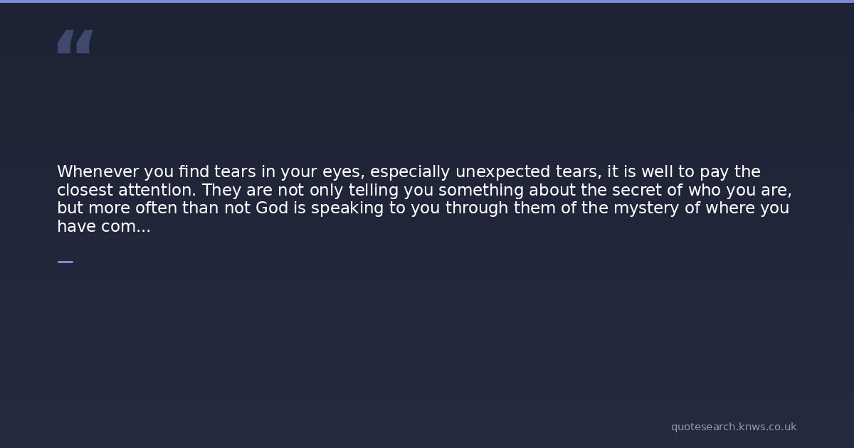 Whenever you find tears in your eyes, especially unexpected tears, it is well to pay the closest attention. They are not only telling you something about the secret of who you are, but more often than not God is speaking to you through them of the mystery of where you have come from and is summoning you to where, if your soul is to be saved, you should go next.