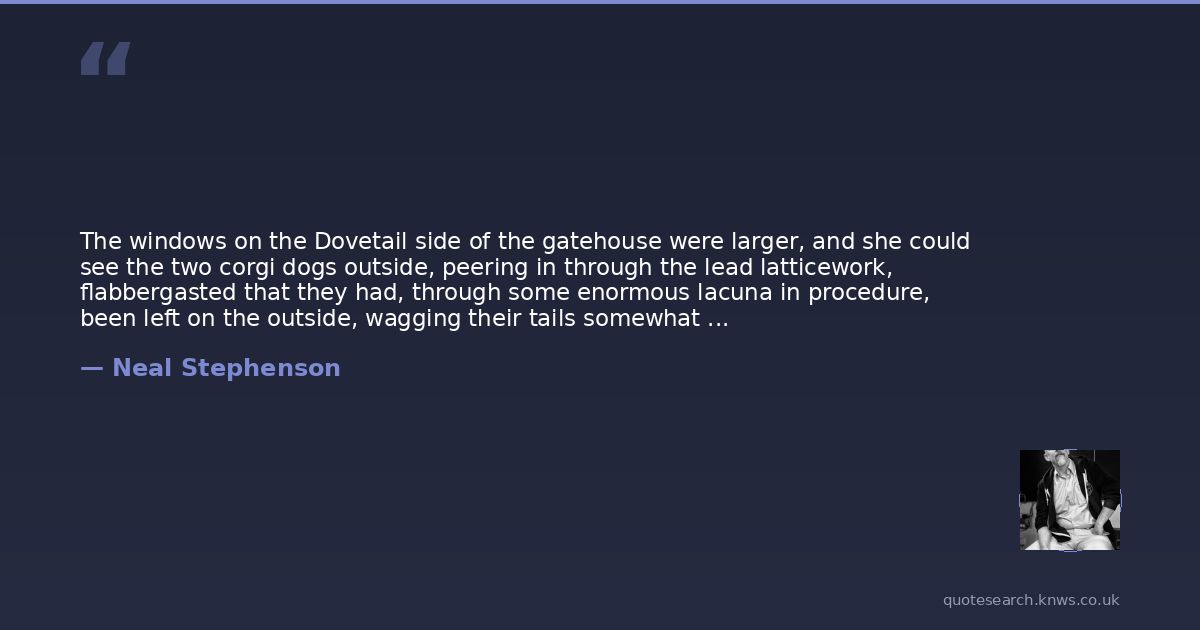 The windows on the Dovetail side of the gatehouse were larger, and she could see the two corgi dogs outside, peering in through the lead latticework, flabbergasted that they had, through some enormous lacuna in procedure, been left on the outside, wagging their tails somewhat uncertainly, as if, in a world that allowed such mistakes, nothing could be counted on.