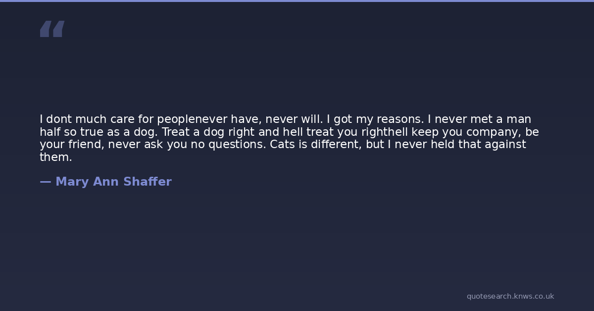 I dont much care for peoplenever have, never will. I got my reasons. I never met a man half so true as a dog. Treat a dog right and hell treat you righthell keep you company, be your friend, never ask you no questions. Cats is different, but I never held that against them.