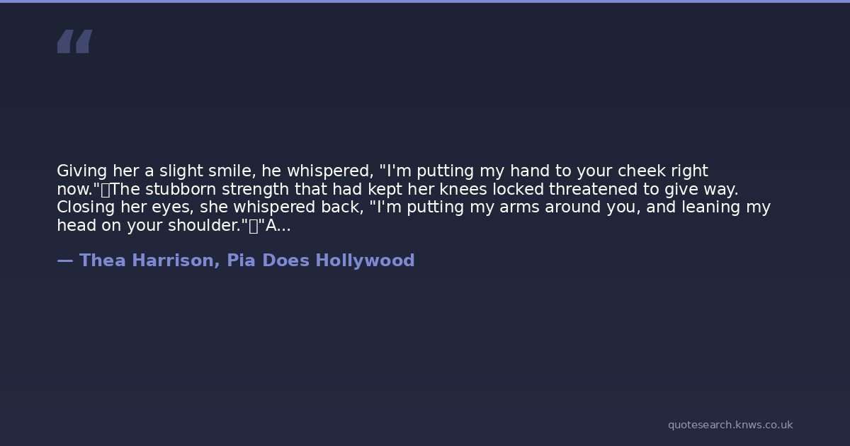 Giving her a slight smile, he whispered, "I'm putting my hand to your cheek right now." The stubborn strength that had kept her knees locked threatened to give way. Closing her eyes, she whispered back, "I'm putting my arms around you, and leaning my head on your shoulder." "And I'm stroking your hair, and kissing you." He took a deep breath. "And I am always, always going to hold on to you with all of my strength. Always, Pia.