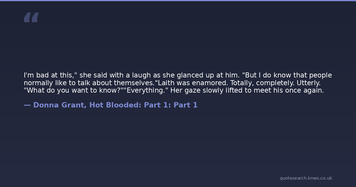 I'm bad at this," she said with a laugh as she glanced up at him. "But I do know that people normally like to talk about themselves."Laith was enamored. Totally, completely. Utterly. "What do you want to know?""Everything." Her gaze slowly lifted to meet his once again.