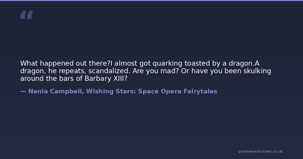What happened out there?I almost got quarking toasted by a dragon.A dragon, he repeats, scandalized. Are you mad? Or have you been skulking around the bars of Barbary XIII?