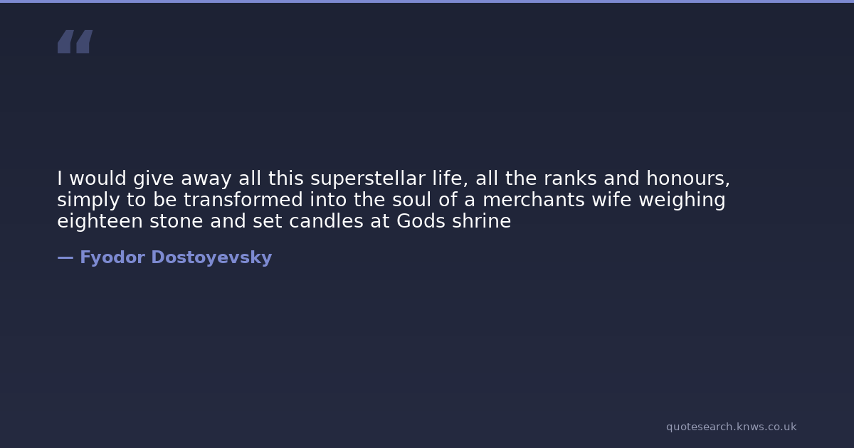 I would give away all this superstellar life, all the ranks and honours, simply to be transformed into the soul of a merchants wife weighing eighteen stone and set candles at Gods shrine