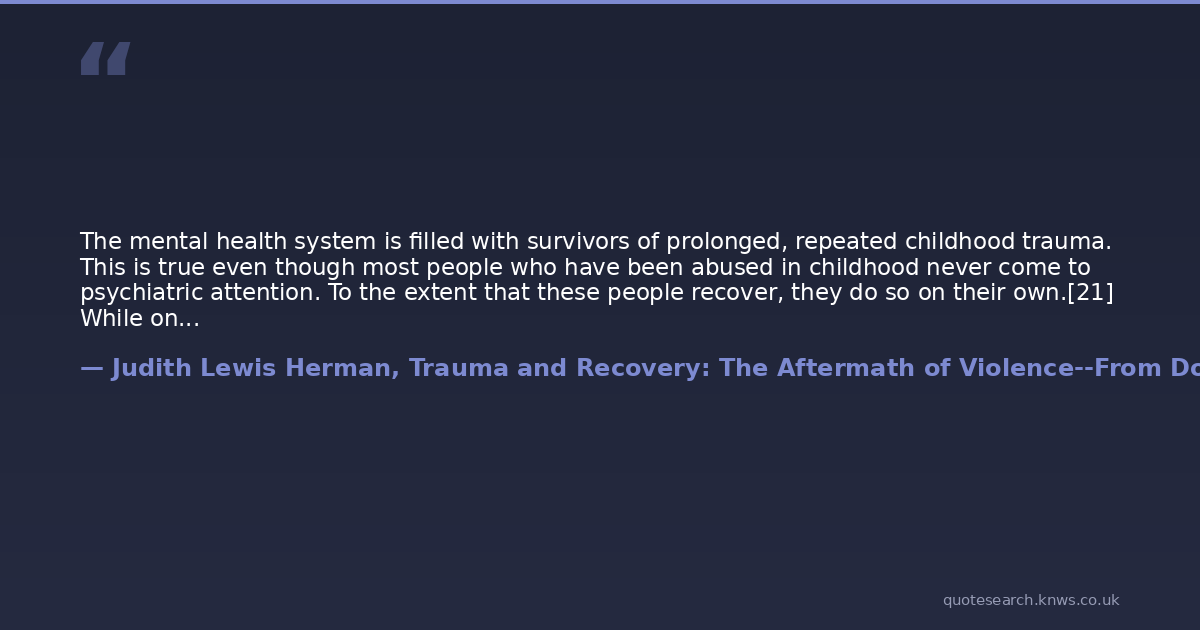 The mental health system is filled with survivors of prolonged, repeated childhood trauma. This is true even though most people who have been abused in childhood never come to psychiatric attention. To the extent that these people recover, they do so on their own.[21] While only a small minority of survivors, usually those with the most severe abuse histories, eventually become psychiatric patients, many or even most psychiatric patients are survivors of childhood abuse.[22] The data on this point are beyond contention. On careful questioning, 50-60 percent of psychiatric inpatients and 40-60 percent of outpatients report childhood histories of physical or sexual abuse or both.[23] In one study of psychiatric emergency room patients, 70 percent had abuse histories.[24] Thus abuse in childhood appears to be one of the main factors that lead a person to seek psychiatric treatment as an adult.[25]