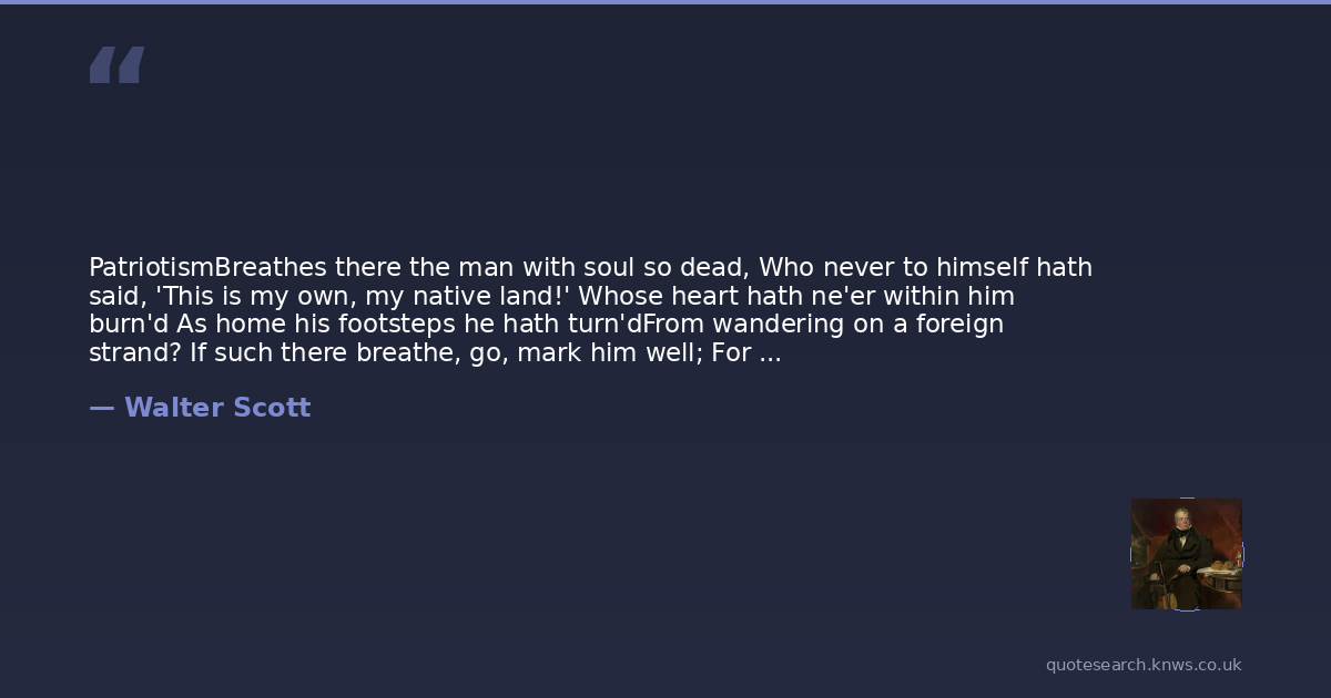 PatriotismBreathes there the man with soul so dead, Who never to himself hath said, 'This is my own, my native land!' Whose heart hath ne'er within him burn'd As home his footsteps he hath turn'dFrom wandering on a foreign strand? If such there breathe, go, mark him well; For him no Minstrel raptures swell; High though his titles, proud his name, Boundless his wealth as wish can claim;Despite those titles, power, and pelf, The wretch, concentred all in self, Living, shall forfeit fair renown, And, doubly dying, shall go down To the vile dust from whence he sprung,Unwept, unhonour'd, and unsung.