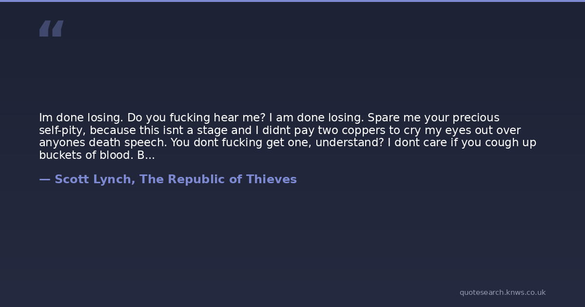 Im done losing. Do you fucking hear me? I am done losing. Spare me your precious self-pity, because this isnt a stage and I didnt pay two coppers to cry my eyes out over anyones death speech. You dont fucking get one, understand? I dont care if you cough up buckets of blood. Buckets I can carry.