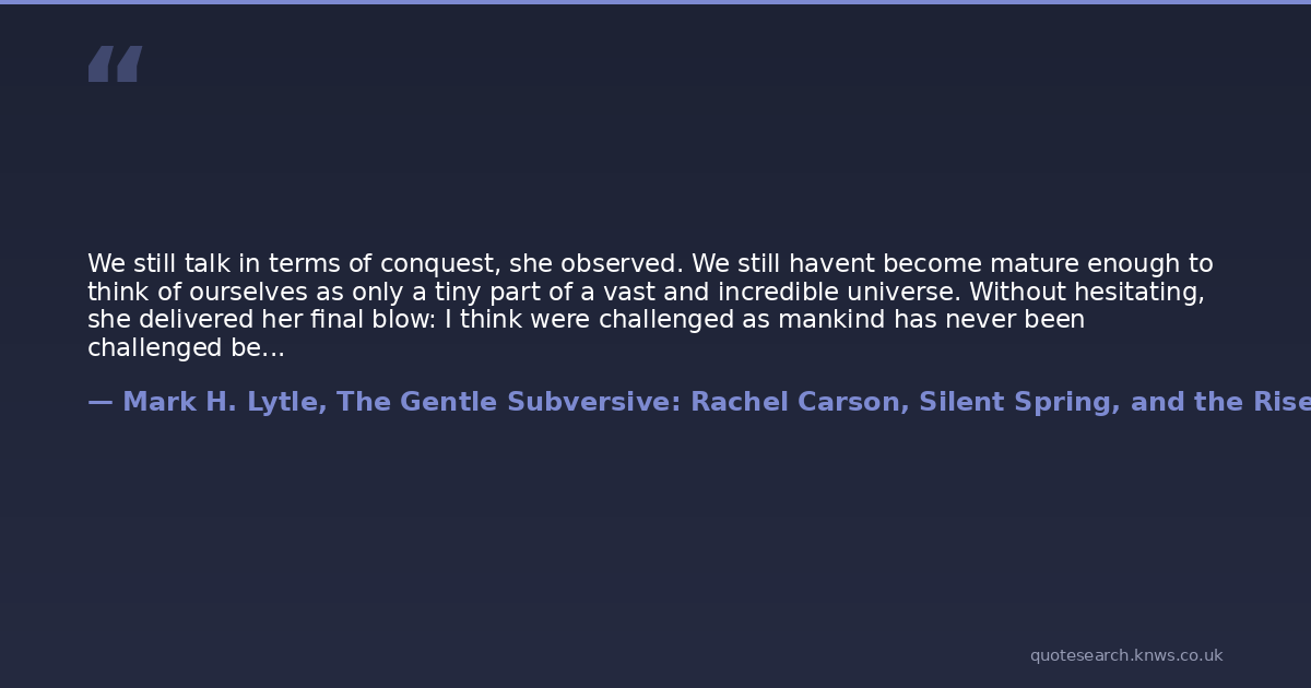 We still talk in terms of conquest, she observed. We still havent become mature enough to think of ourselves as only a tiny part of a vast and incredible universe. Without hesitating, she delivered her final blow: I think were challenged as mankind has never been challenged before, to prove our maturity and our mastery, not of nature, but of ourselves.