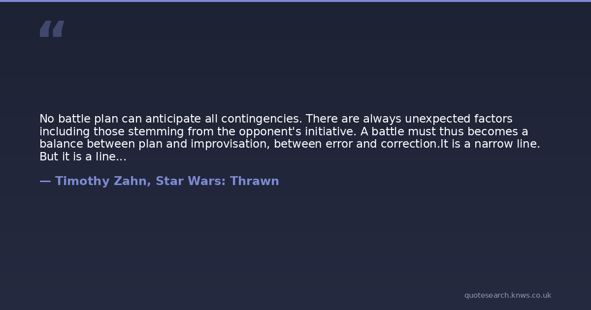 No battle plan can anticipate all contingencies. There are always unexpected factors including those stemming from the opponent's initiative. A battle must thus becomes a balance between plan and improvisation, between error and correction.It is a narrow line. But it is a line one's opponent must also walk. For all the balance of experience and cleverness, it is often the warrior who acts quickest who will prevail.