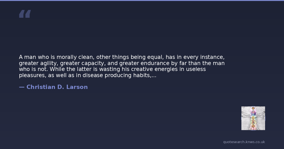 A man who is morally clean, other things being equal, has in every instance, greater agility, greater capacity, and greater endurance by far than the man who is not. While the latter is wasting his creative energies in useless pleasures, as well as in disease producing habits, the former is turning all of his creative energy into ability and genius, and the result is evident.