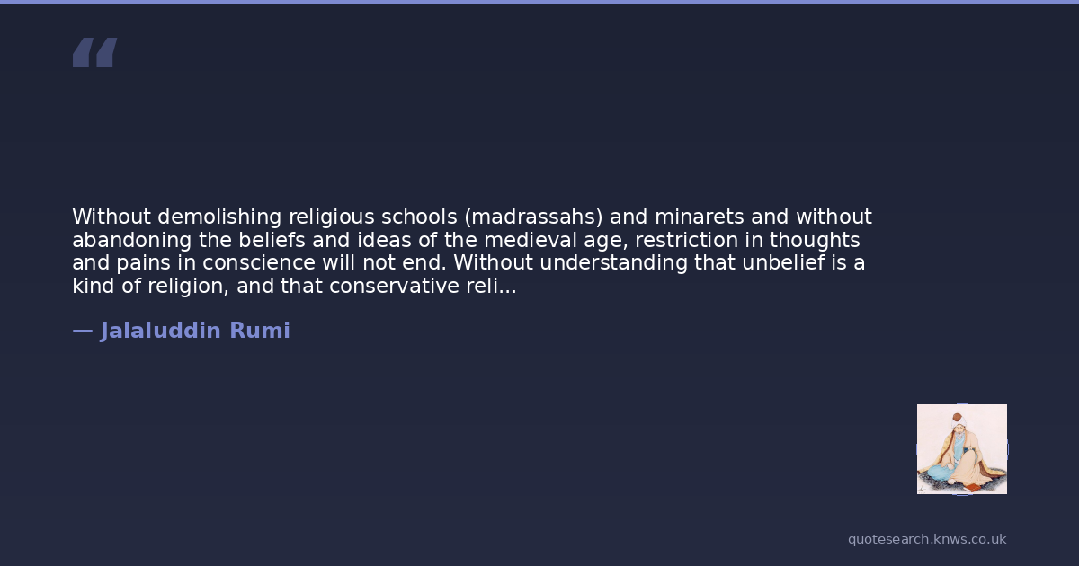 Without demolishing religious schools (madrassahs) and minarets and without abandoning the beliefs and ideas of the medieval age, restriction in thoughts and pains in conscience will not end. Without understanding that unbelief is a kind of religion, and that conservative religious belief a kind of disbelief, and without showing tolerance to opposite ideas, one cannot succeed. Those who look for the truth will accomplish the mission.Mevlana Jalal ad-Din RUMI