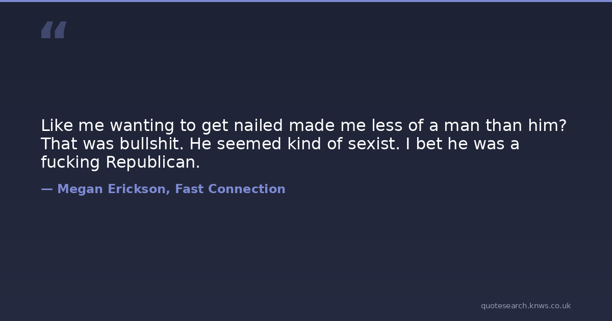Like me wanting to get nailed made me less of a man than him? That was bullshit. He seemed kind of sexist. I bet he was a fucking Republican.