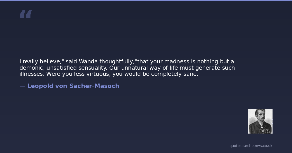 I really believe," said Wanda thoughtfully,"that your madness is nothing but a demonic, unsatisfied sensuality. Our unnatural way of life must generate such illnesses. Were you less virtuous, you would be completely sane.