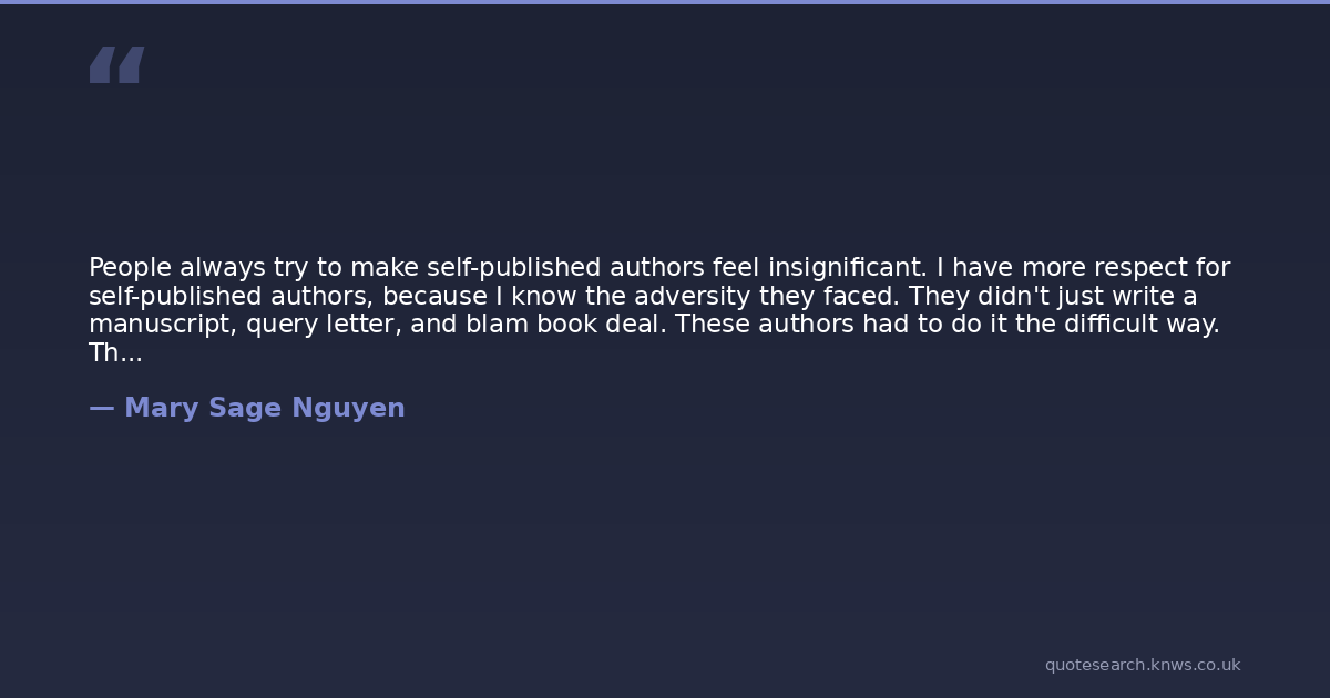 People always try to make self-published authors feel insignificant. I have more respect for self-published authors, because I know the adversity they faced. They didn't just write a manuscript, query letter, and blam book deal. These authors had to do it the difficult way. There is no publisher, or agents, investing time, and money into making their book. Just the indie author's manuscript, own currency, and persistence.