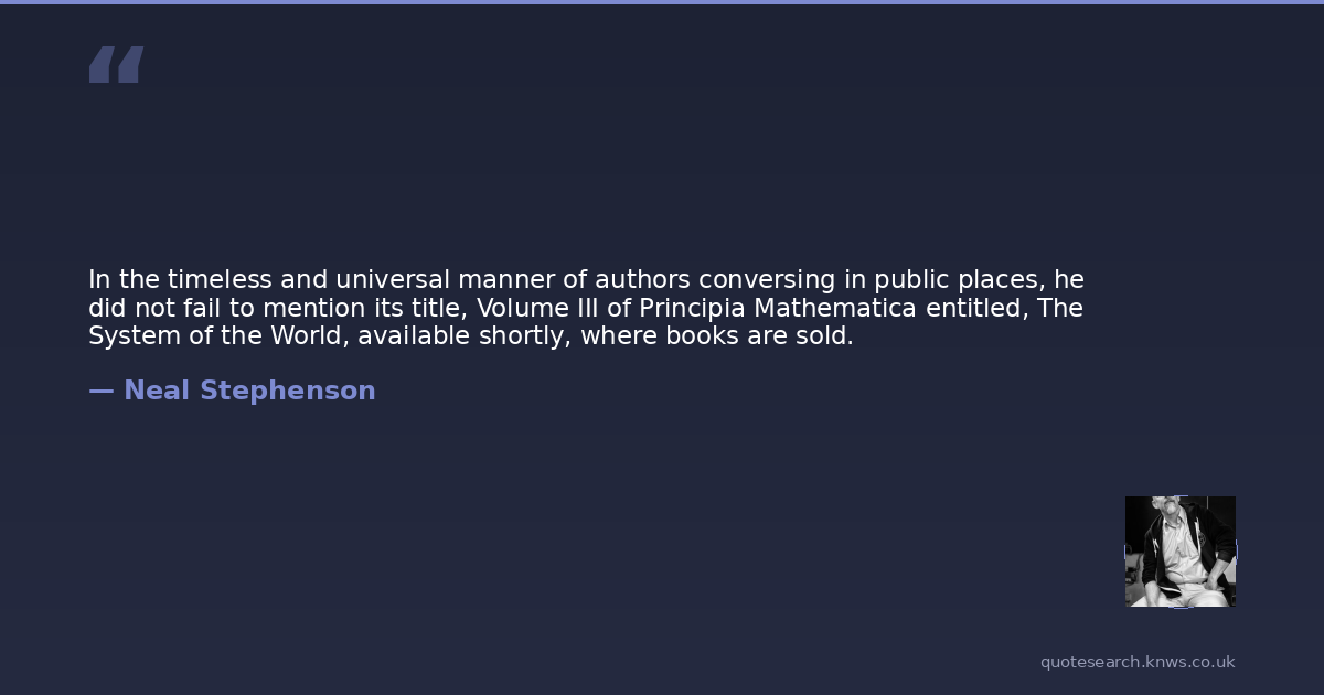 In the timeless and universal manner of authors conversing in public places, he did not fail to mention its title, Volume III of Principia Mathematica entitled, The System of the World, available shortly, where books are sold.