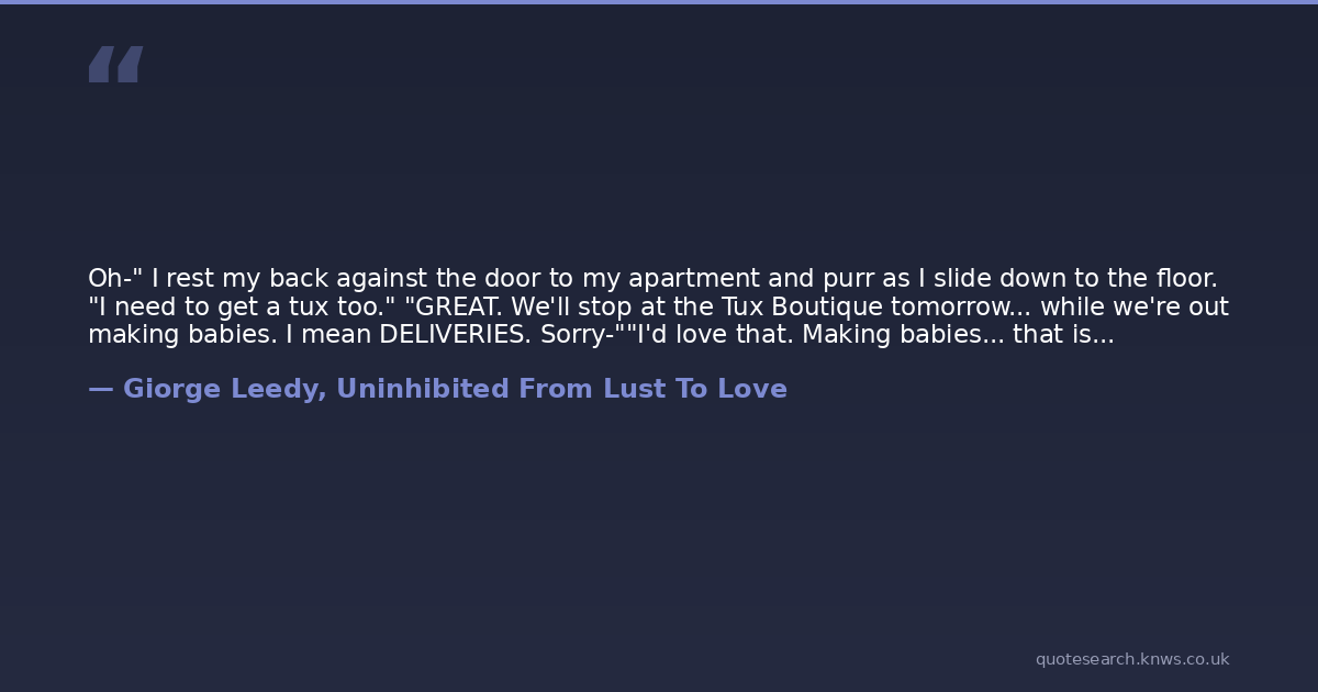Oh-" I rest my back against the door to my apartment and purr as I slide down to the floor. "I need to get a tux too." "GREAT. We'll stop at the Tux Boutique tomorrow... while we're out making babies. I mean DELIVERIES. Sorry-""I'd love that. Making babies... that is...