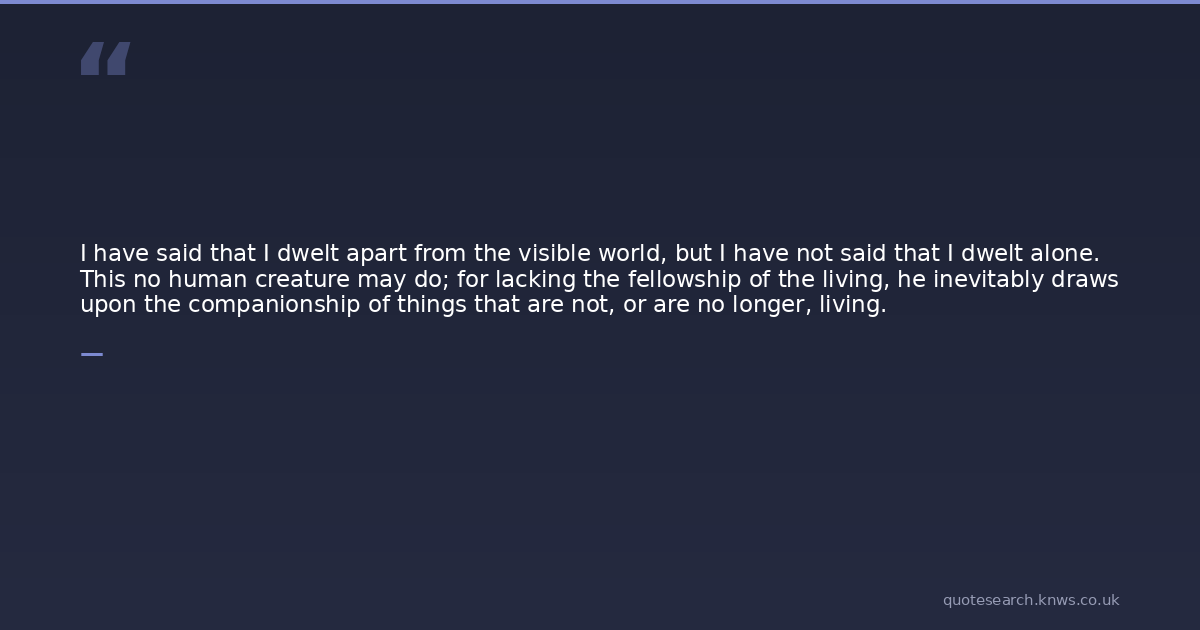 I have said that I dwelt apart from the visible world, but I have not said that I dwelt alone. This no human creature may do; for lacking the fellowship of the living, he inevitably draws upon the companionship of things that are not, or are no longer, living.