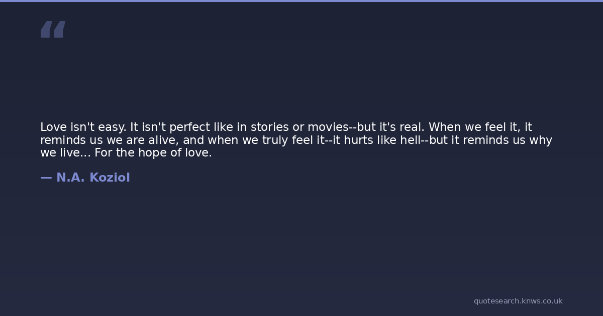 Love isn't easy. It isn't perfect like in stories or movies--but it's real. When we feel it, it reminds us we are alive, and when we truly feel it--it hurts like hell--but it reminds us why we live... For the hope of love.