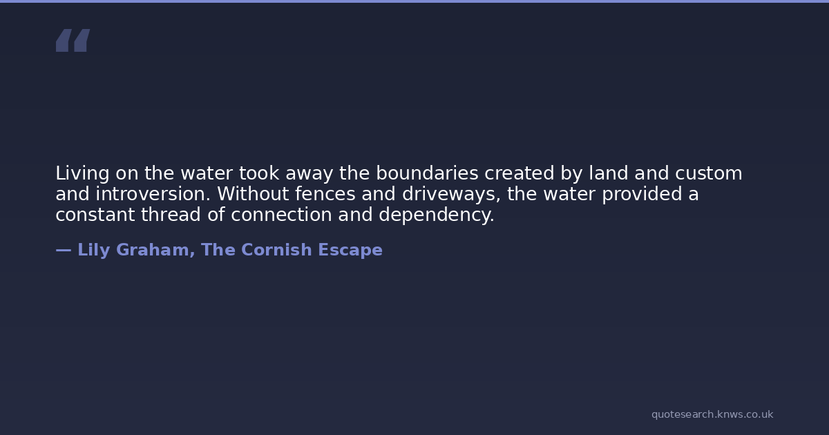 Living on the water took away the boundaries created by land and custom and introversion. Without fences and driveways, the water provided a constant thread of connection and dependency.