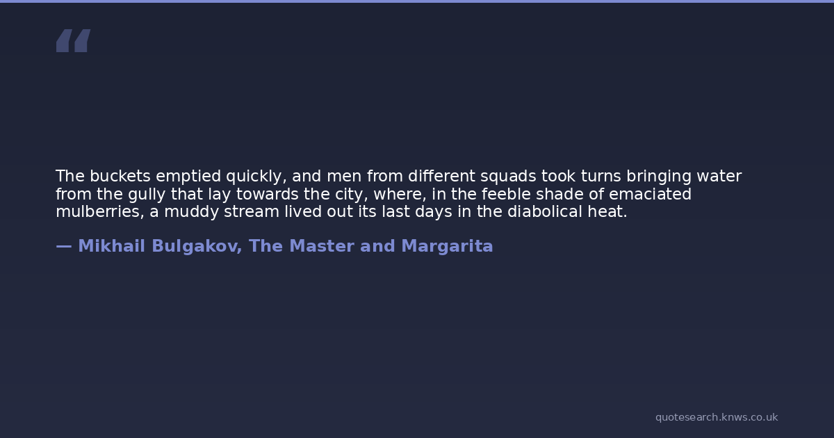The buckets emptied quickly, and men from different squads took turns bringing water from the gully that lay towards the city, where, in the feeble shade of emaciated mulberries, a muddy stream lived out its last days in the diabolical heat.