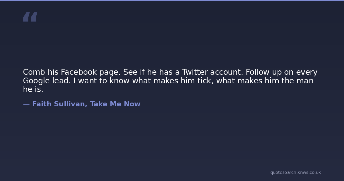 Comb his Facebook page. See if he has a Twitter account. Follow up on every Google lead. I want to know what makes him tick, what makes him the man he is.