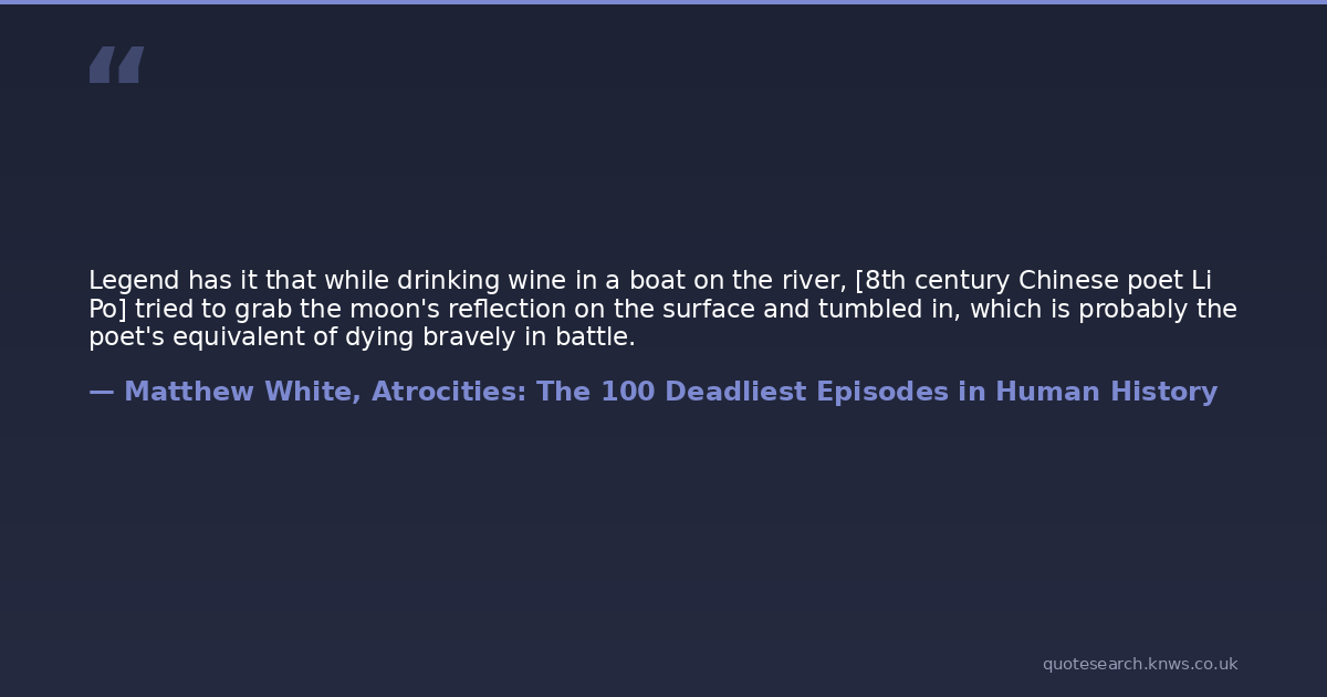 Legend has it that while drinking wine in a boat on the river, [8th century Chinese poet Li Po] tried to grab the moon's reflection on the surface and tumbled in, which is probably the poet's equivalent of dying bravely in battle.