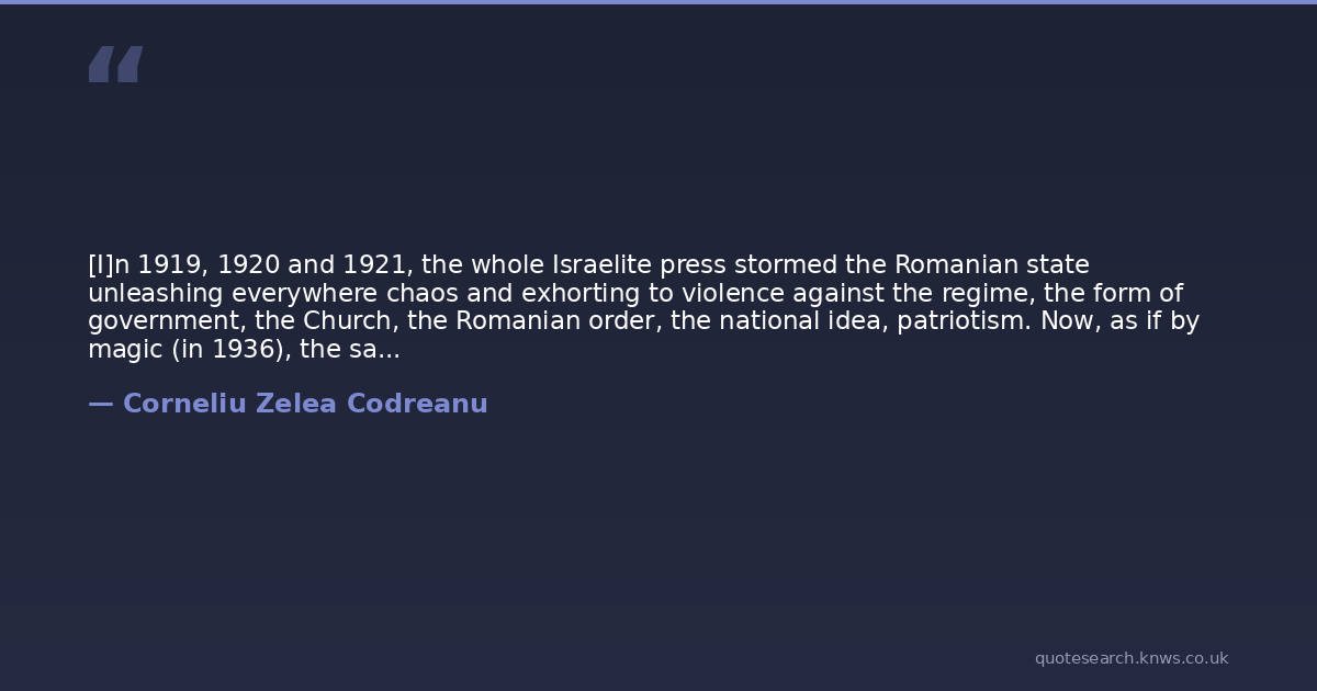 [I]n 1919, 1920 and 1921, the whole Israelite press stormed the Romanian state unleashing everywhere chaos and exhorting to violence against the regime, the form of government, the Church, the Romanian order, the national idea, patriotism. Now, as if by magic (in 1936), the same press, led exactly by the same people, has turned into a protector of the state order and its laws, and declares itself 'against violence', and we have become the 'enemies of the country', the 'right-wing extremists', 'in the pay and in the service of the enemy of Romanicity', and, before long, we will hear even this: that we are sponsored by the Jews.