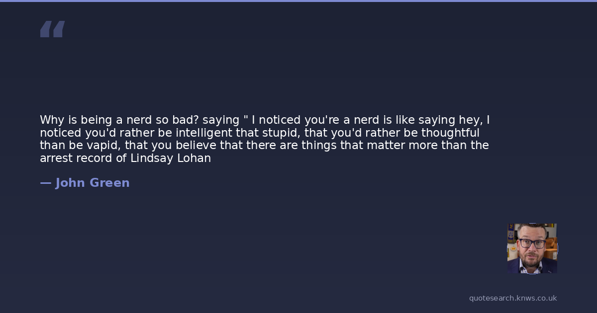 Why is being a nerd so bad? saying " I noticed you're a nerd is like saying hey, I noticed you'd rather be intelligent that stupid, that you'd rather be thoughtful than be vapid, that you believe that there are things that matter more than the arrest record of Lindsay Lohan
