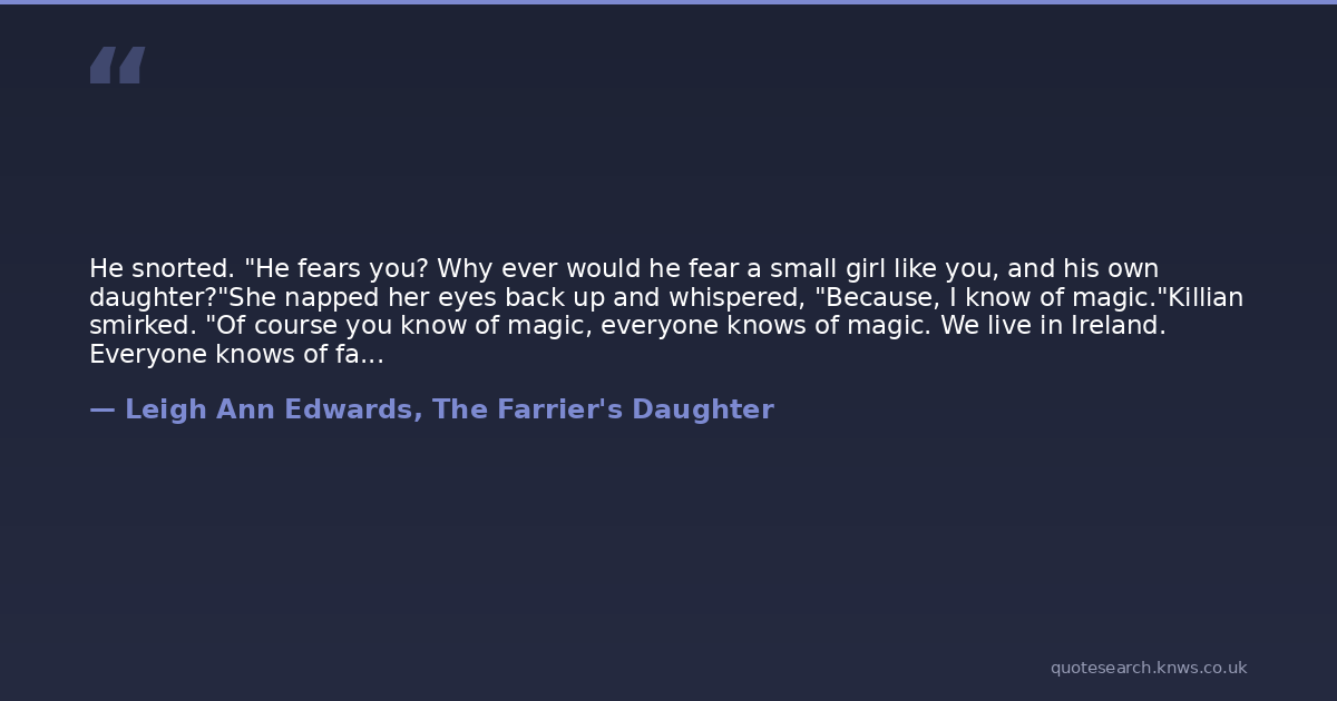 He snorted. "He fears you? Why ever would he fear a small girl like you, and his own daughter?"She napped her eyes back up and whispered, "Because, I know of magic."Killian smirked. "Of course you know of magic, everyone knows of magic. We live in Ireland. Everyone knows of fairies and druids, and the like. Magic cannot be disputed, even if the priests do not take kindly to these beliefs.""Aye, but I can do magic.