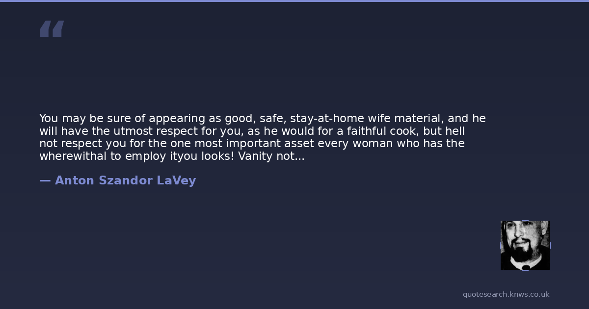 You may be sure of appearing as good, safe, stay-at-home wife material, and he will have the utmost respect for you, as he would for a faithful cook, but hell not respect you for the one most important asset every woman who has the wherewithal to employ ityou looks! Vanity not only keeps a woman young, but also gives her something to live for, and if you get saddled to a man who stifles this basic female urge, yet ogles its effects in other women, he could well be knocking years off your life.
