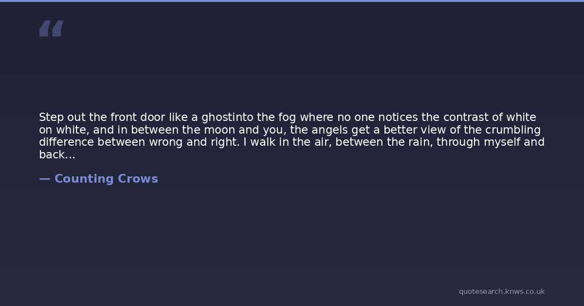 Step out the front door like a ghostinto the fog where no one notices the contrast of white on white, and in between the moon and you, the angels get a better view of the crumbling difference between wrong and right. I walk in the air, between the rain, through myself and back again where? I don't know.