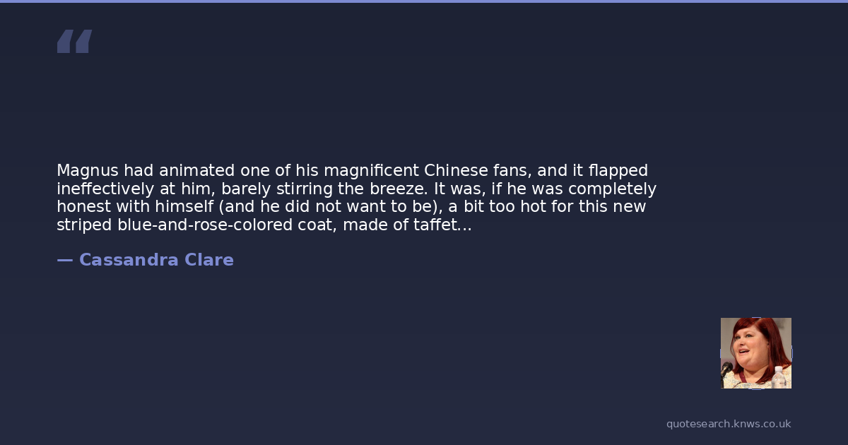 Magnus had animated one of his magnificent Chinese fans, and it flapped ineffectively at him, barely stirring the breeze. It was, if he was completely honest with himself (and he did not want to be), a bit too hot for this new striped blue-and-rose-colored coat, made of taffeta and satin, and the silk faille waistcoat embroidered with a scene of birds and cherubs. The wing collar, and the wig, and the silk breeches, the wonderful new gloves in the most delicate lemon yellow . . . it was all a bit warm.Still. If one could look this fabulous, one had an obligation to. One should wear everything, or one should wear nothing at all.