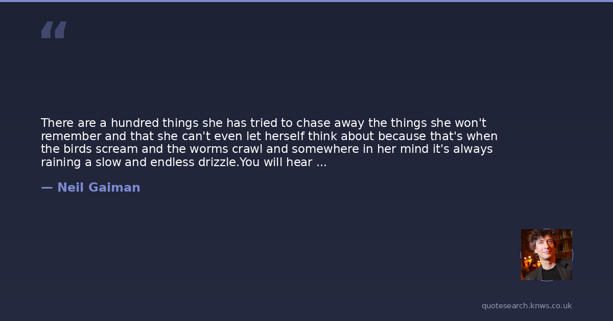 There are a hundred things she has tried to chase away the things she won't remember and that she can't even let herself think about because that's when the birds scream and the worms crawl and somewhere in her mind it's always raining a slow and endless drizzle.You will hear that she has left the country, that there was a gift she wanted you to have, but it is lost before it reaches you. Late one night the telephone will sign, and a voice that might be hers will say something that you cannot interpret before the connection crackles and is broken.Several years later, from a taxi, you will see someone in a doorway who looks like her, but she will be gone by the time you persuade the driver to stop. You will never see her again. Whenever it rains you will think of her.