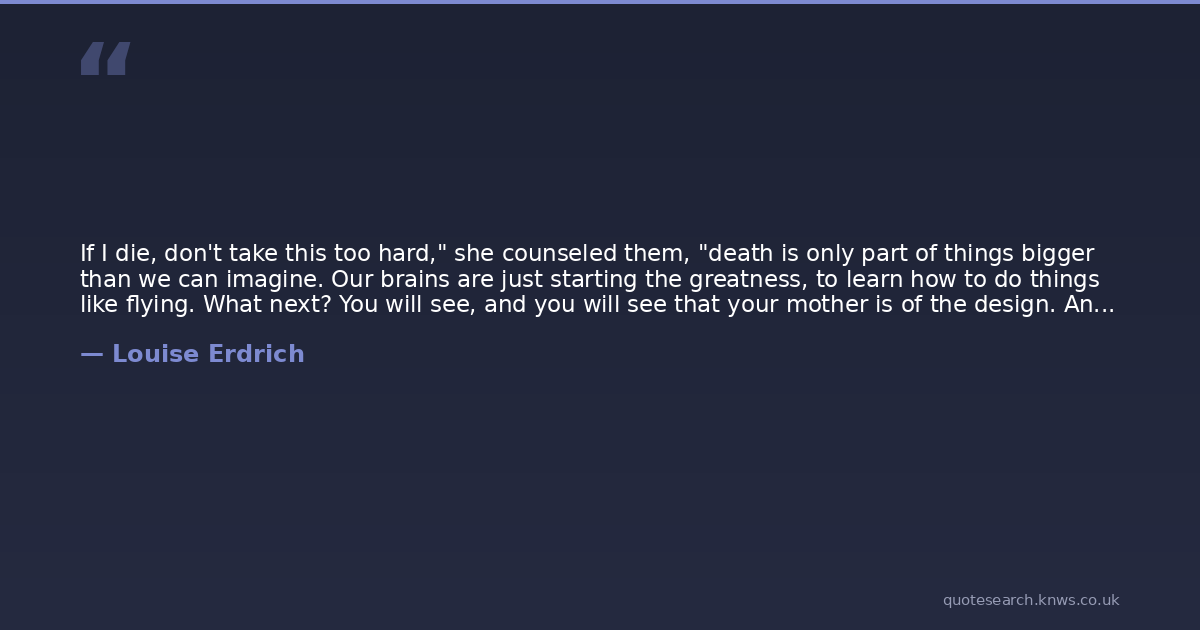 If I die, don't take this too hard," she counseled them, "death is only part of things bigger than we can imagine. Our brains are just starting the greatness, to learn how to do things like flying. What next? You will see, and you will see that your mother is of the design. And I will always be made of things, and things will always be made of me. Nothing can get rid of me because I am already included into the pattern.