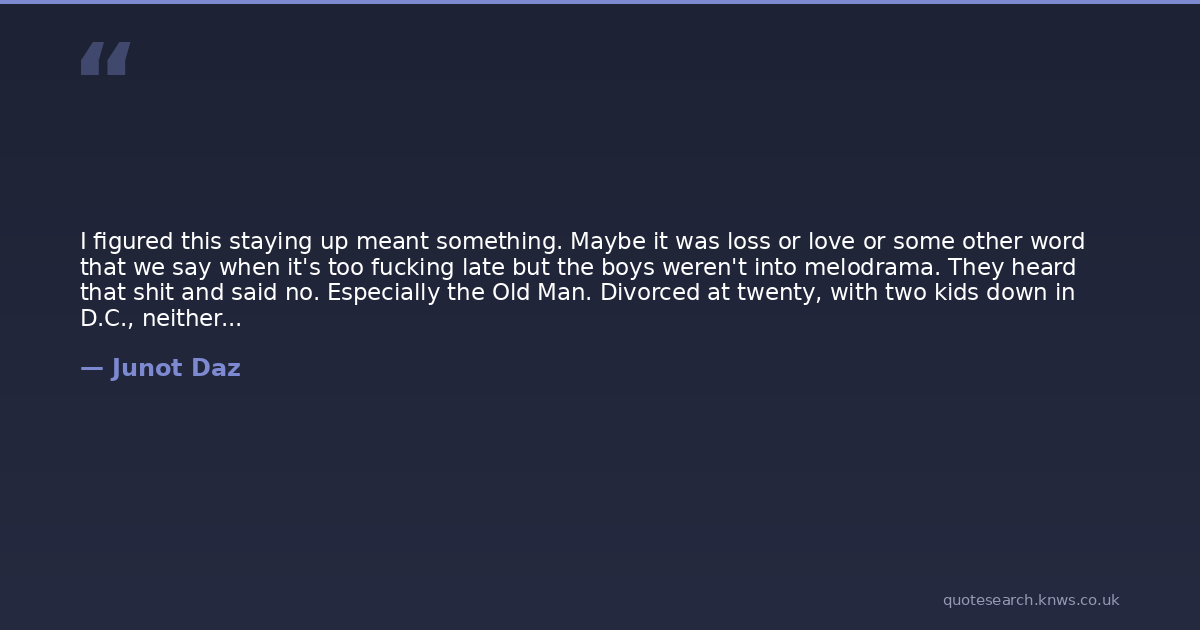I figured this staying up meant something. Maybe it was loss or love or some other word that we say when it's too fucking late but the boys weren't into melodrama. They heard that shit and said no. Especially the Old Man. Divorced at twenty, with two kids down in D.C., neither of which he sees anymore. He heard me and said, Listen. There are forty-four ways to get over this. He showed me his bitten-up hands.