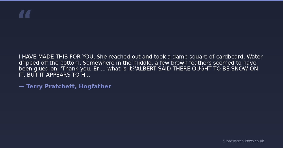 I HAVE MADE THIS FOR YOU. She reached out and took a damp square of cardboard. Water dripped off the bottom. Somewhere in the middle, a few brown feathers seemed to have been glued on. 'Thank you. Er ... what is it?'ALBERT SAID THERE OUGHT TO BE SNOW ON IT, BUT IT APPEARS TO HAVE MELTED, said Death. IT IS, OF COURSE, A HOGSWATCH CARD.'Oh ...' THERE SHOULD HAVE BEEN A ROBIN ON IT AS WELL, BUT I HAD CONSIDERABLE DIFFICULTY IN GETTING IT TO STAY ON. 'Ah...'IT WAS NOT AT ALL COOPERATIVE.'Really ...?'IT DID NOT SEEM TO GET INTO THE HOGSWATCH SPIRIT AT ALL.