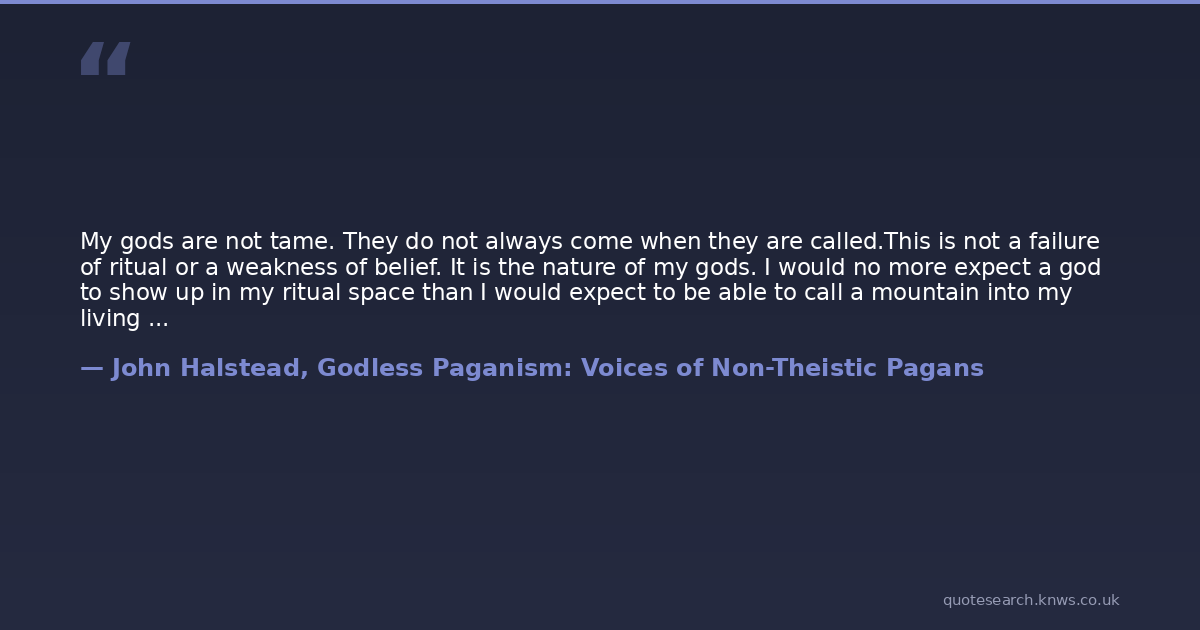 My gods are not tame. They do not always come when they are called.This is not a failure of ritual or a weakness of belief. It is the nature of my gods. I would no more expect a god to show up in my ritual space than I would expect to be able to call a mountain into my living room. That is simply not the nature of mountains. If I want to meet a mountain, I am the one who must move." - Alison Leigh Lilly, "Gods Like Mountains, Gods Like Mist