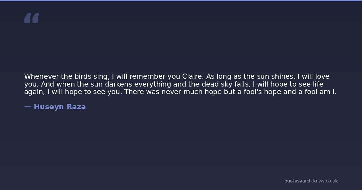 Whenever the birds sing, I will remember you Claire. As long as the sun shines, I will love you. And when the sun darkens everything and the dead sky falls, I will hope to see life again, I will hope to see you. There was never much hope but a fool's hope and a fool am I.